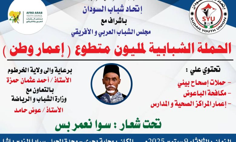 دشن اتحاد شباب السودان بالشراكة مع مجلس الشباب العربي الافريقي الثلاثاء الحملة الشبابية لمليون متطوع (إعمار وطن) والتي جاءت تحت شعار ( نعمر سوا بس ) بسرايا الزبير باشا بمنطقة الجيلي شمال محلية بحري