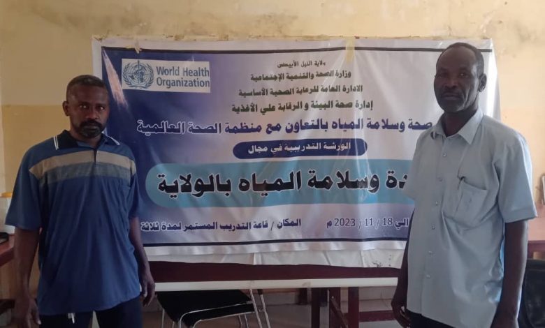 شهد الاستاذ محي الدين عزالدين ابوبكر مدير ترصد وجودة وسلامة المياه بادارة صحة البيئة بوزارة الصحة ولاية النيل الابيض صباح اليوم بقاعة مركز التدريب المستمر بربك الورشة التدريبية في مجال جودة وسلامة المياه التي نظمتها ادارة قسم صحة وسلامة المياه بالتعاون مع منظمة الصحة العالمية بحضور الاستاذ موسي احمد محمداني ممثل منظمة الصحة العالمية .