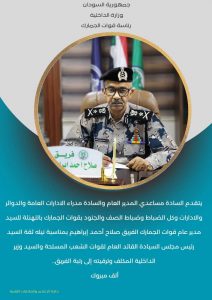 يتقدم السادة مساعدي المدير العام والسادة مدراء الادارات العامة والدوائر والادارات وكل الضباط وضباط الصف والجنود بقوات الجمارك ، بالتهنئة للسيد مدير عام قوات الجمارك الفريق صلاح أحمد ابراهيم ، بمناسبة نيله ثقة السيد رئيس مجلس السيادة القائد العام لقوات الشعب المسلحة ،والسيد وزير الداخلية المكلف وترقيته الى رتبة الفريق.