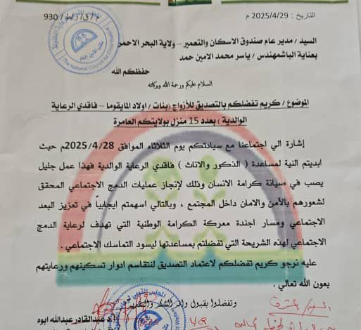 طالب الأمين العام للمجلس القومي لرعاية الطفولة، الدكتور عبد القادر عبد الله أبوه، عبر خطاب رسمي موجه إلى المهندس ياسر محمد الأمين حمد، المدير العام لصندوق الإسكان والتعمير بولاية البحر الأحمر، بضرورة التصديق على تمليك 15 منزلًا للأزواج المتزوجين حديثًا من فئة فاقدي الرعاية الوالدية، وذلك بتوجيه من وزير التنمية الاجتماعية، مولانا أحمد آدم بخيت دخري، الذي أكد على أهمية هذه الفئة وحقها في الاستقرار عبر صندوق الإسكان والتعمير بالولاية.