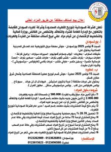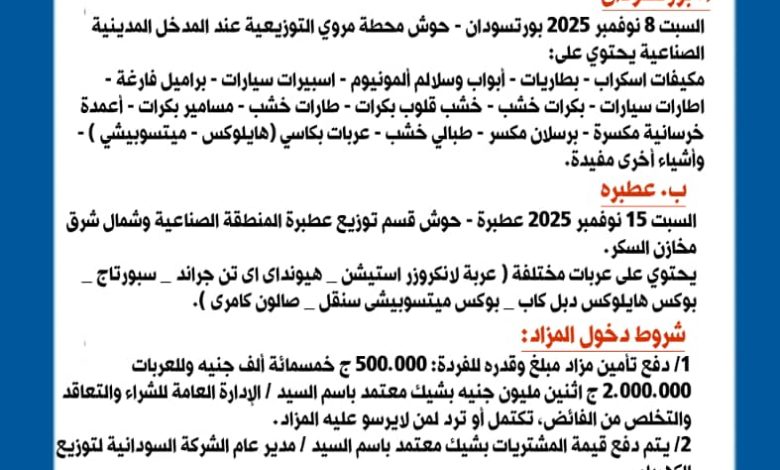 تعلن الشركة السودانية لتوزيع الكهرباء المحدودة وشركة كهرباء السودان القابضة بالتعاون مع الادارة العامة للشراء والتعاقد والتخلص من الفائض بوزارة المالية والتخطيط الاقتصادي عن قيام مزاد علني لبيع أصناف مختلفة من الخردة والعربات