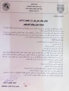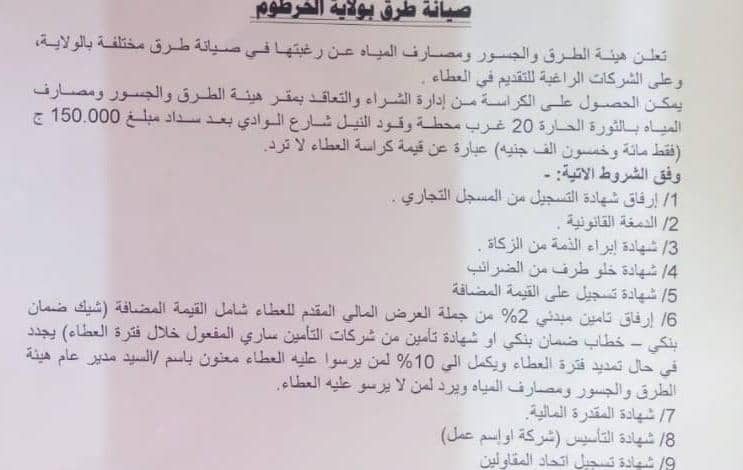 إعلان عطاء رقم (20) للعام 2025م … صيانة طرق بولاية الخرطوم