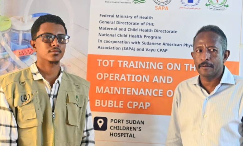 أطلقت وزارة الصحة الاتحادية، بالتعاون مع تجمع الأطباء السودانيين بأمريكا (سابا)، ورشة تدريب المدربين على استخدام جهاز ضغط الهواء الموجب المستمر (CPAP) في مستشفى الأطفال التعليمي بمدينة بورتسودان.