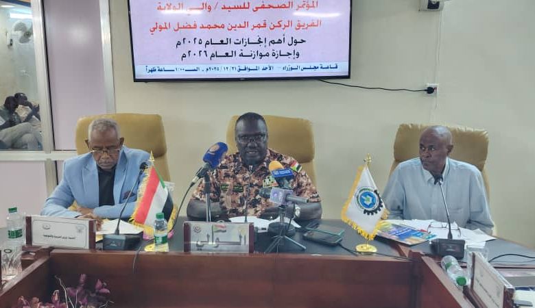 عقد والي النيل الأبيض الفريق ركن قمر الدين محمد فضل المولى والي ولاية النيل الأبيض مؤتمرا صحفيا بأمانة الحكومة بربك استعرض من خلال إنجازات العام 2025 وميزانية العام 2026 وذلك بحضور عدد من أعضاء حكومة الولاية والأمين العام لحكومة الولاية والمستشار القانوني والاعلامين والصحفين