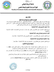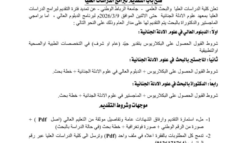 تعلن كلية الدراسات العليا والبحث العلمي جامعة الرباط الوطني عن عن تمديد فتح فترة التقديم البرامج للدراسات العليا بمعهد الادلة الجنائية حتى 3/9/2026 م البرنامج الدبلوم العالي ، اما برامجي الماجستير والدكتوارة بالبحث يتم التقديم لها على مدار العام على النحو التالي: