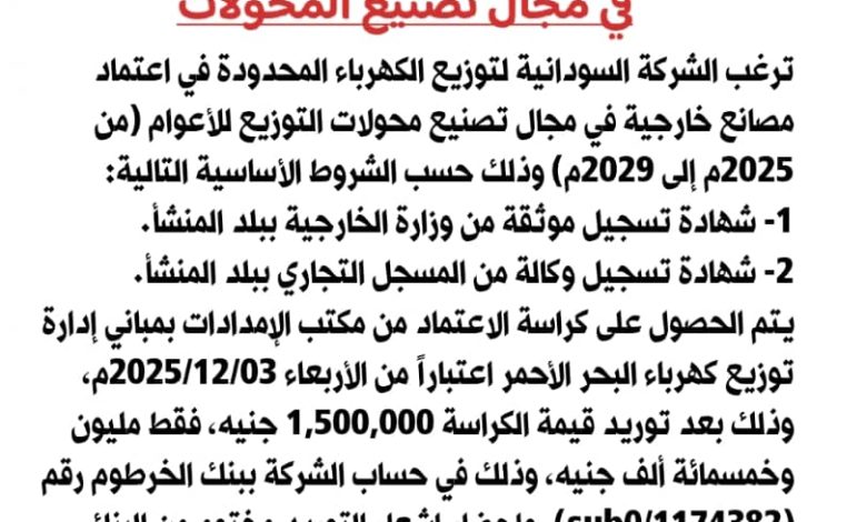 الشركة السودانية لتوزيع الكهرباء المحدودة … اعلان ملحق اعتماد مصانع خارجية في مجال تصنيع المحولات